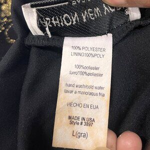 This black and gold floral midi dress is a quintessential tribute to the eclectic 1990s, a period that celebrated individuality and charm. A wearable piece of history, this dress captures the essence of the era with its vibrant floral pattern set against a timeless black backdrop. The polyester material ensures a comfortable fit while offering a gentle shimmer that makes the gold hues come alive. Its unique spaghetti straps and a playful asymmetrical hem give this dress a distinctively 90s look that's both whimsical and elegant. Perfect for any fashion-forward vintage lover, it's designed to flatter a variety of body types, ensuring you feel as fabulous as you look. As a special token of appreciation, we include a complimentary jewelry gift with your purchase to add that perfect finishing touch to your outfit. As a vintage item, it embodies stories and experiences of a bygone era, and we encourage you to continue its legacy.
