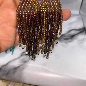 Add a touch of sophistication with these chic beaded dangle earrings. Featuring a blend of brown and gold beads, they are perfect for any occasion.
