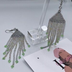 Enhance your style with these chic beaded fringe earrings. Featuring a stunning combination of silver and green beads, they add a vibrant touch to any outfit.