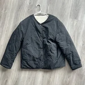 Elegant black jacket with a cozy lining. Features a button-up front. Reversible coat.