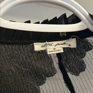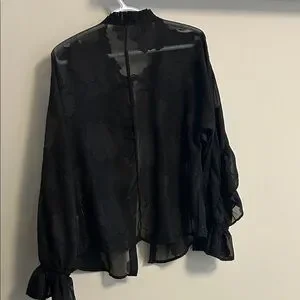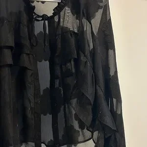 Elevate your style with this chic black sheer blouse, featuring elegant ruffles for a sophisticated look. Perfect for any occasion.