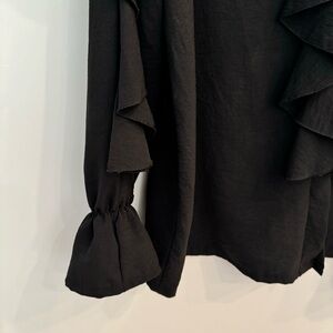 Elevate your style with this chic black ruffled blouse. Perfect for any occasion, it adds a touch of elegance to your wardrobe.