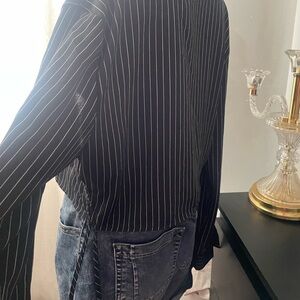 Elegant black button-up shirt with white stripes. Ideal for a sophisticated look. With side draw string to shorten or lengthen waist Size medium