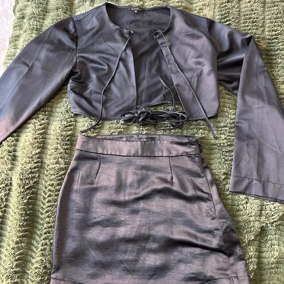 Stylish black two-piece set with a cropped top and skirt. Perfect for a modern look.