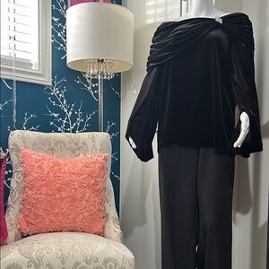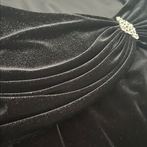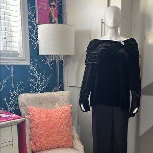Elevate your style with this chic black velvet top The off-shoulder design and elegant draping make it perfect for any occasion. The beautiful shimmer and stunning brooch makes this a must have for any woman’s wardrobe.