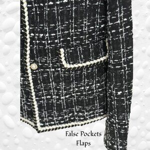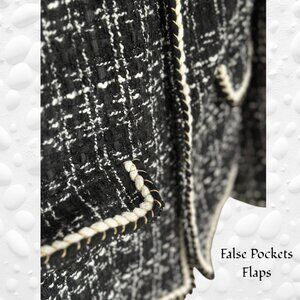 Elevate your wardrobe with this timeless black tweed jacket featuring a structured silhouette and elegant detailing. The textured grid pattern is accented by refined white and black piping interwoven with subtle gold thread, adding a touch of sophistication. Designed with a round neckline and two pearl-style buttons down the front, this jacket offers a clean, tailored look. 100% Polyester, Machine Wash.