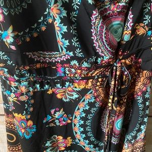 Embrace a bohemian vibe with this chic black mini dress, adorned with vibrant patterns. Perfect for casual outings or a night out.