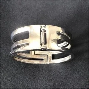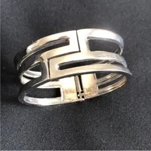 Stylish silver coloured hinged bracelet with a modern design. Perfect for any occasion. 2 3/8” in diameter