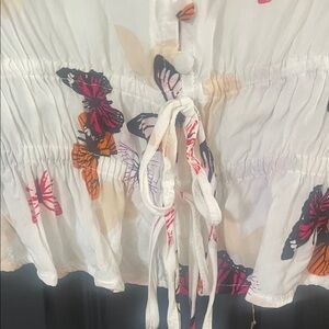 Stylish cream blouse featuring a vibrant butterfly print. Perfect for adding a touch of elegance to your casual wardrobe.