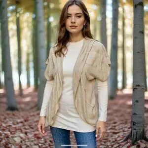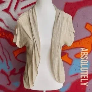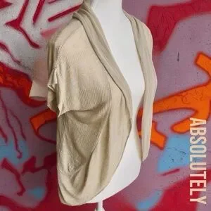 Elegant cream short sleeve cardigan with a draped open front. Ideal for layering.