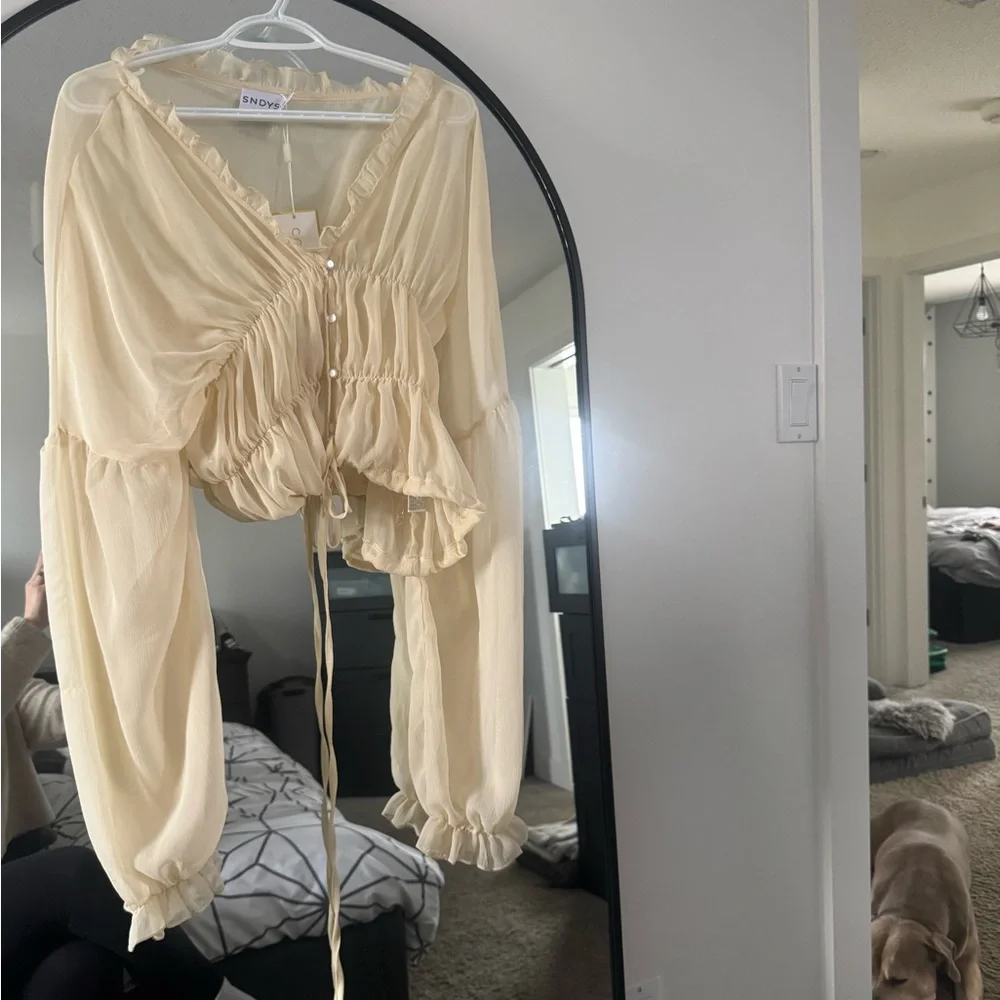 This chic cream blouse features stylish ruffles and a comfortable fit, ideal for any occasion.