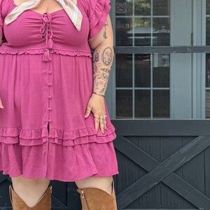 Turn heads with this chic fuchsia mini dress, featuring playful ruffles and a flattering silhouette. Perfect for any occasion.