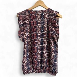 Add a touch of elegance to your wardrobe with this chic geometric print blouse. The navy and burgundy colors create a sophisticated look, perfect for any occasion.