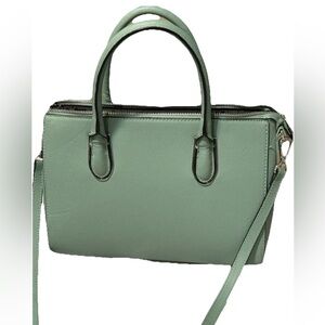 This stylish green satchel features a structured rectangular shape with slightly rounded edges, offering a modern and elegant look. Equipped with dual top handles and a removable shoulder strap, it provides versatile carrying options. Crafted from a smooth, faux leather material, this medium-sized bag is perfect for everyday use or as a work accessory.