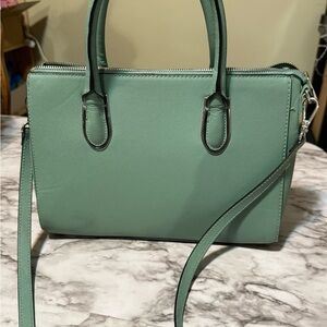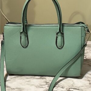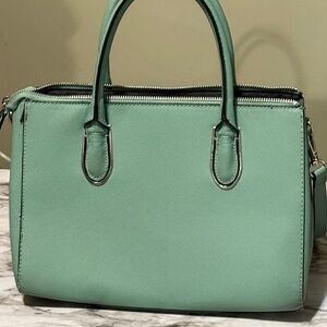 This elegant green handbag is perfect for any occasion. Its sleek design and vibrant color make it a standout accessory.great condition. No damage, a bit of a scuff mark on the bottom corner of bag and a bit of wear on the sides (see photos) very minimal wear, the bag is in great condition! Measures: 12in wide by 9 inches height.