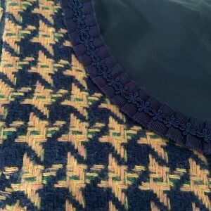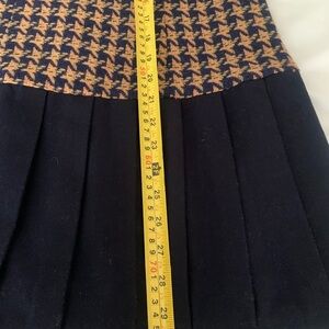 Sleeveless mini dress with a tan and navy houndstooth knit top and pleated navy bottom.