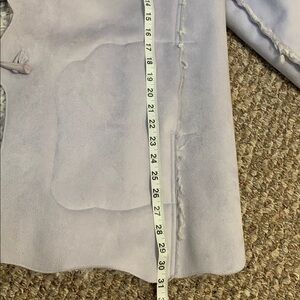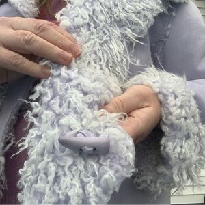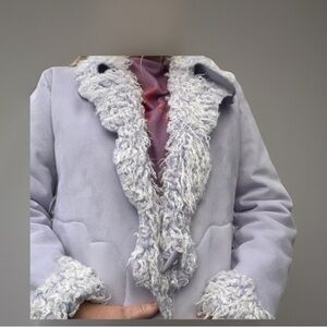 Elevate your wardrobe with this Linda Lundstrum chic lavender reversible teddy jacket. One side looks and feels like suede, or reverse it for the sheep’s fur look. Perfect for adding a touch of elegance to your outfit.