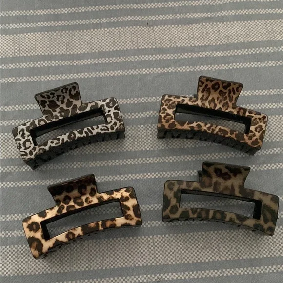 Set of four chic leopard pattern hair claw clips. Perfect for adding style to any look.