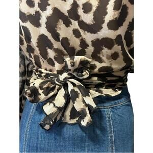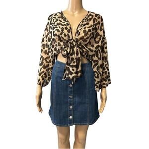 Elevate your casual wardrobe with this stylish ensemble featuring a leopard print wrap top and a classic denim skirt. The wrap top boasts a flattering v-neck and can be tied at the back or front for versatile styling options. It features wide sleeves that add a breezy touch. The denim skirt offers a trendy button-down design, accentuating your silhouette while providing comfort and ease. Perfect for a day out or a casual evening look.