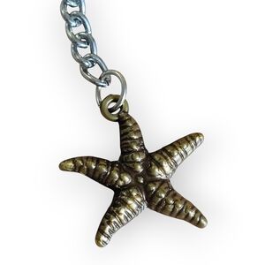 Stylish keychain with a starfish, gold teardrop, and pink and blue charms.