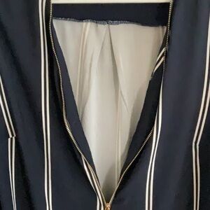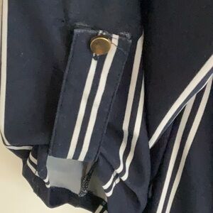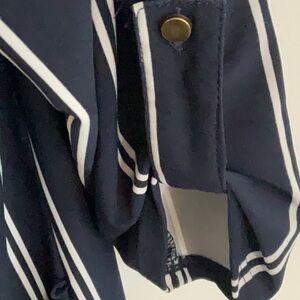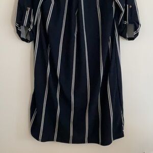 Elegant navy dress featuring white vertical stripes. Stylish buttoned sleeves add a touch of sophistication.