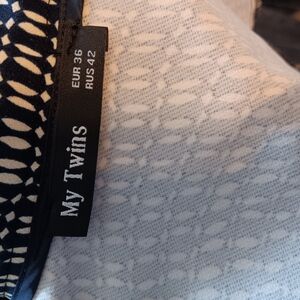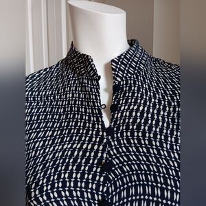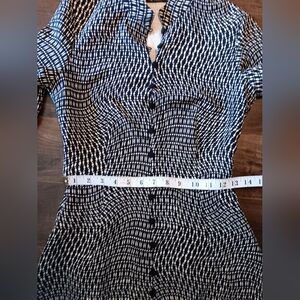 Stylish black/dark navy and cream patterned dress with long sleeves and button details. Perfect for any occasion.