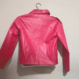 Trendy faux leather jacket. Vibrant pink color. Stylish zippered pockets. Perfect for a bold look.