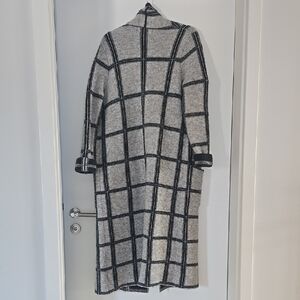 Stylish long cardigan with a classic plaid pattern. Perfect for layering. Soft and comfortable fabric.