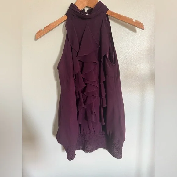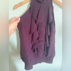 Elevate your style with this chic plum ruffle blouse. Perfect for adding a touch of elegance to any outfit.