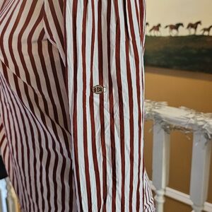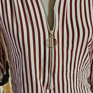 Elevate your style with this chic red wine and white striped blouse. The modern zipper detail adds a touch of sophistication, perfect for any occasion.