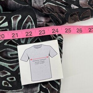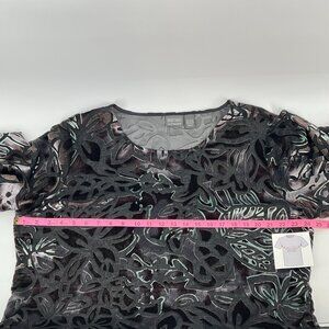 Make a statement with this elegant and airy 3/4-sleeve blouse from Additions by Chico's, size [3]. This stunning piece features a soft, flowy silhouette in sheer black fabric, beautifully adorned with a unique abstract floral and leaf pattern in shades of brown.