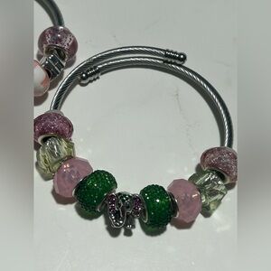 Enhance your style with this chic silver bracelet adorned with pink and green beads. Perfect for any occasion.