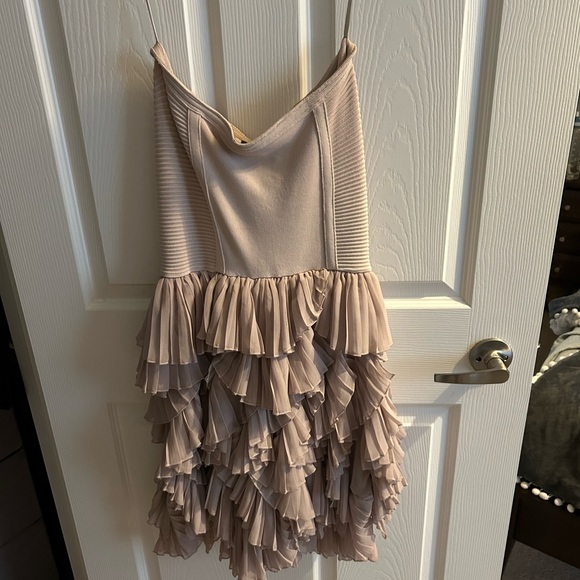 Step out in style with this chic strapless dress featuring elegant ruffle details. Perfect for any occasion, this cream dress offers a blend of sophistication and comfort.