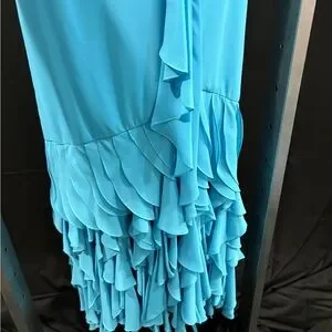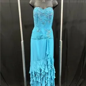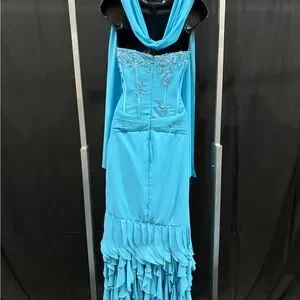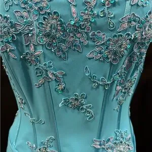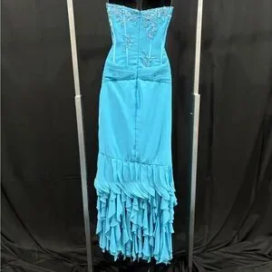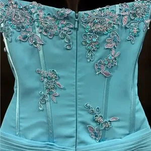 Make a statement at your next event with this chic turquoise strapless prom dress. The elegant design features intricate embellishments and a cascading ruffle skirt, perfect for adding a touch of glamour to your evening.