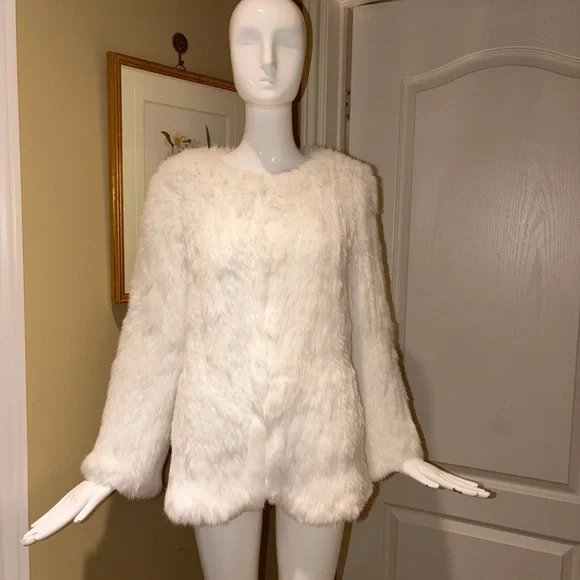 Elevate your style with this chic white fur jacket. Perfect for adding a touch of elegance to any outfit. Like new. No returns. No refunds.