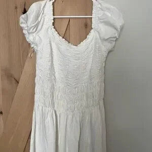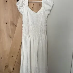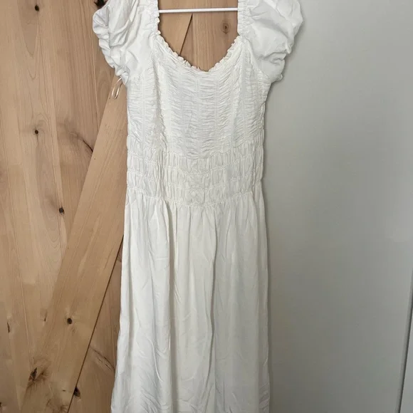 This chic white midi dress features a stylish ruched design, perfect for any occasion. Its timeless elegance makes it a versatile addition to your wardrobe.