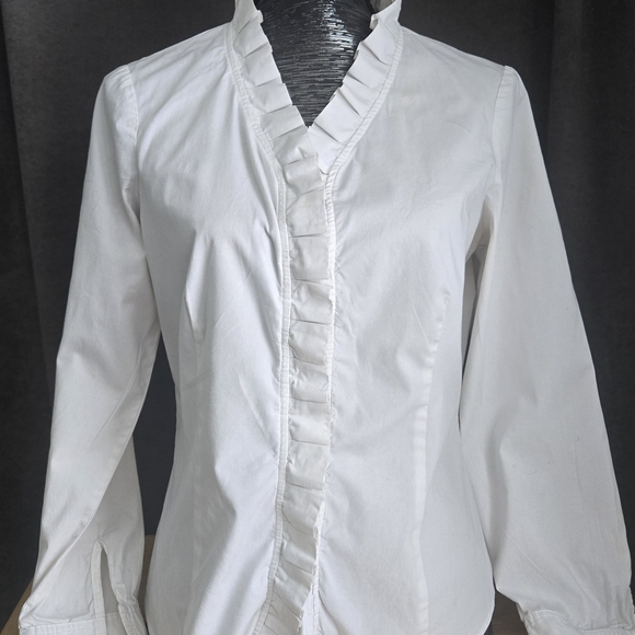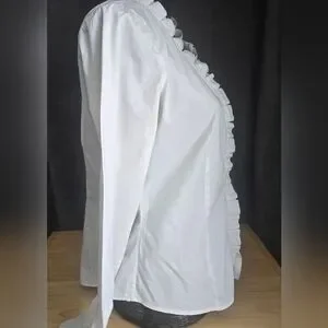 This chic white blouse features elegant ruffled detailing, perfect for adding a touch of sophistication to your wardrobe.