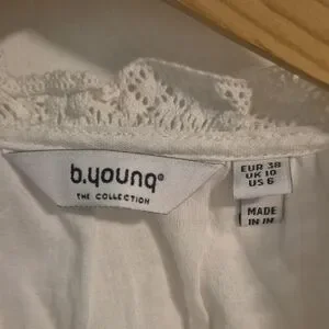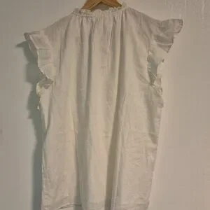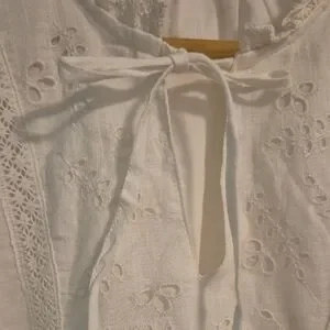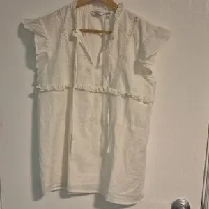 Elevate your wardrobe with this chic white blouse, featuring elegant ruffles and delicate lace accents. Perfect for any occasion.