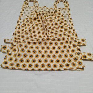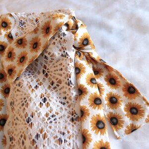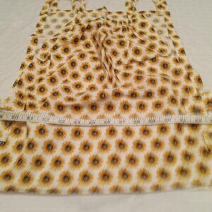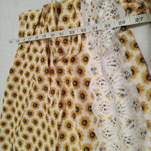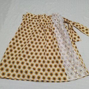 Chic asymmetrical handmade tank top and apron set, made of poplin with sunflower motifs, and a matching skirt decorated with lace and an elastic belt with a buckle (a small patch protects a seam at the back of the skirt)