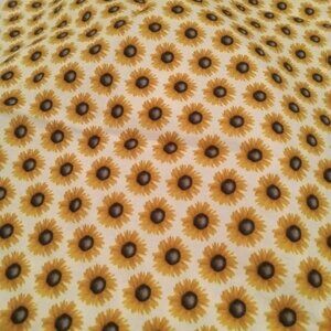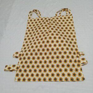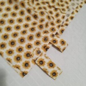 Ensemble de débardeur-tablier chic asymétrique fait à la main, en popeline avec motifs de tournesols, et d'une jupe assortie, décorée de dentelle et d'une ceinture élastique avec boucle (un petit patch protège une couture à l'arrière de la jupe)