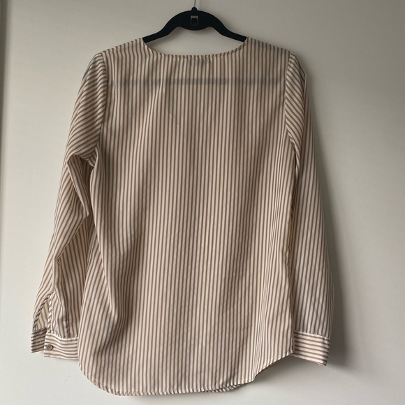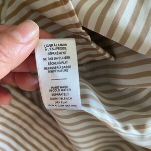 In very good condition except a mark on the left shoulder (see photo). A semi-sheer soft-to-the-touch, flowy material with superior quality oversight that ensures stripes align with the stripes on the pockets and cuffs. Fabric retains its smoothness after washing with no need for ironing. Extra button.
