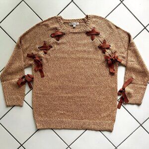 Chic and cozy tan sweater from Francesca’s featuring eye-catching lace-up ribbon details for a feminine twist. Perfect for fall layering and effortlessly stylish with jeans, skirts, or leather pants/minis.