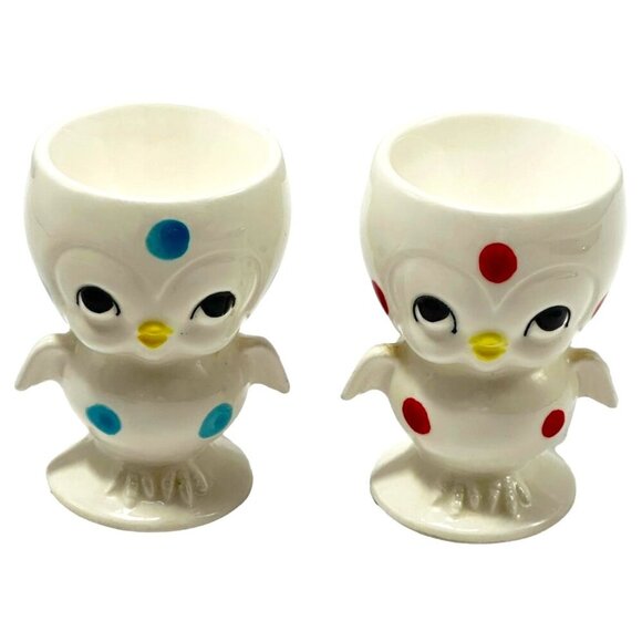 Chick Anthropomorphic Bird Egg Cup Polka Dot Lot 2 White Blue Red Vintage 60s