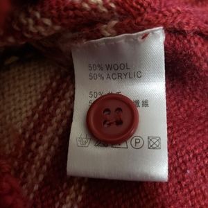 Knit ribbed cardigan with geometric patterns. Button front closure. Wool blend fabric. In an excellent pre loved condition. Beautiful fall colors:moss green burnt orange and beige.