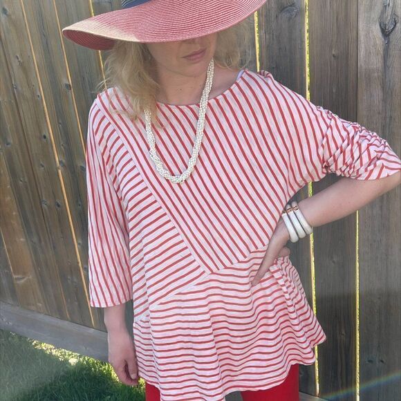 EUC knit top from Chico. Off white with orange/red stripe in asymmetrical pattern. Labelled size 3 which converts to large, x large. Model (size 10) is wearing it as an oversized tunic. 60% cotton, 40% modal, long sleeve, asymmetric stripe pattern. Cool and easy to wear. Finish the look with some coordinating pieces from Our Closet (some suggestions shown all listed and priced separately), make a bundle to save a bundle. There is always something Fresh at Lemon Squeezy Shop🍋