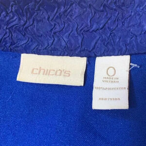 This Chico blazer is a gorgeous shade of blue. Use this to brighten up the holidays or use it in all four seasons. The fabric is soft and made of wrinkle free polyester. Delicate wash and hang to dry.