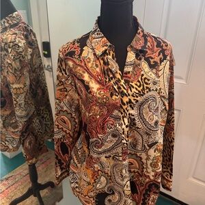 Absolutely lovely and elegant, high quality no-iron poplin cotton, hidden buttons half way down so looks like tunic. Fresh green colour. Barely worn, a tad big on me.