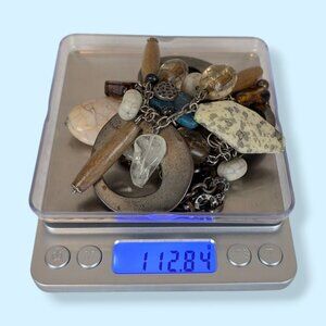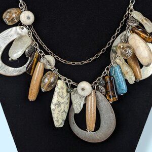 This necklace by Chico's is made of a silver tone metal and has an adjustable lobster clasp closure with a stamped maker's tag. There is a sturdy chain from the clasp towards the front where it splits into two smaller chains. The top chain is plain, while the lower chain has all kinds of pieces dangling from it. The pieces include round flat pieces of metal, wooden cylinders, glass, and natural stones. The necklace has normal wear, including tone change in the chain metal towards the back and marks in the surface of the dangling pieces, but is still very wearable.