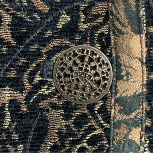 Features: Embossed buttons, notched collar, velvet trim, fully lined, tapestry fabric