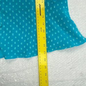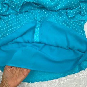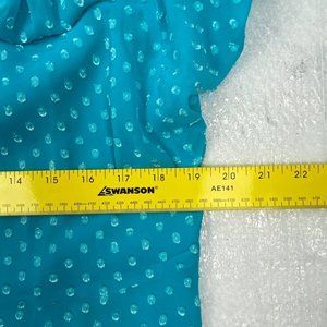 Chico's blouse, women's size 1, medium, size 8, blue top, peplum blouse, flutter sleeve, clip dot, polka dot, V-neck, short sleeve, button front, lined blouse, casual top, dressy top, officewear, feminine blouse, polyester